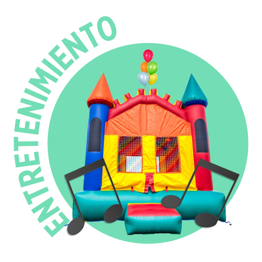 Música en vivo, animación, área de recreación infantil con saltarín y caritas pintadas.